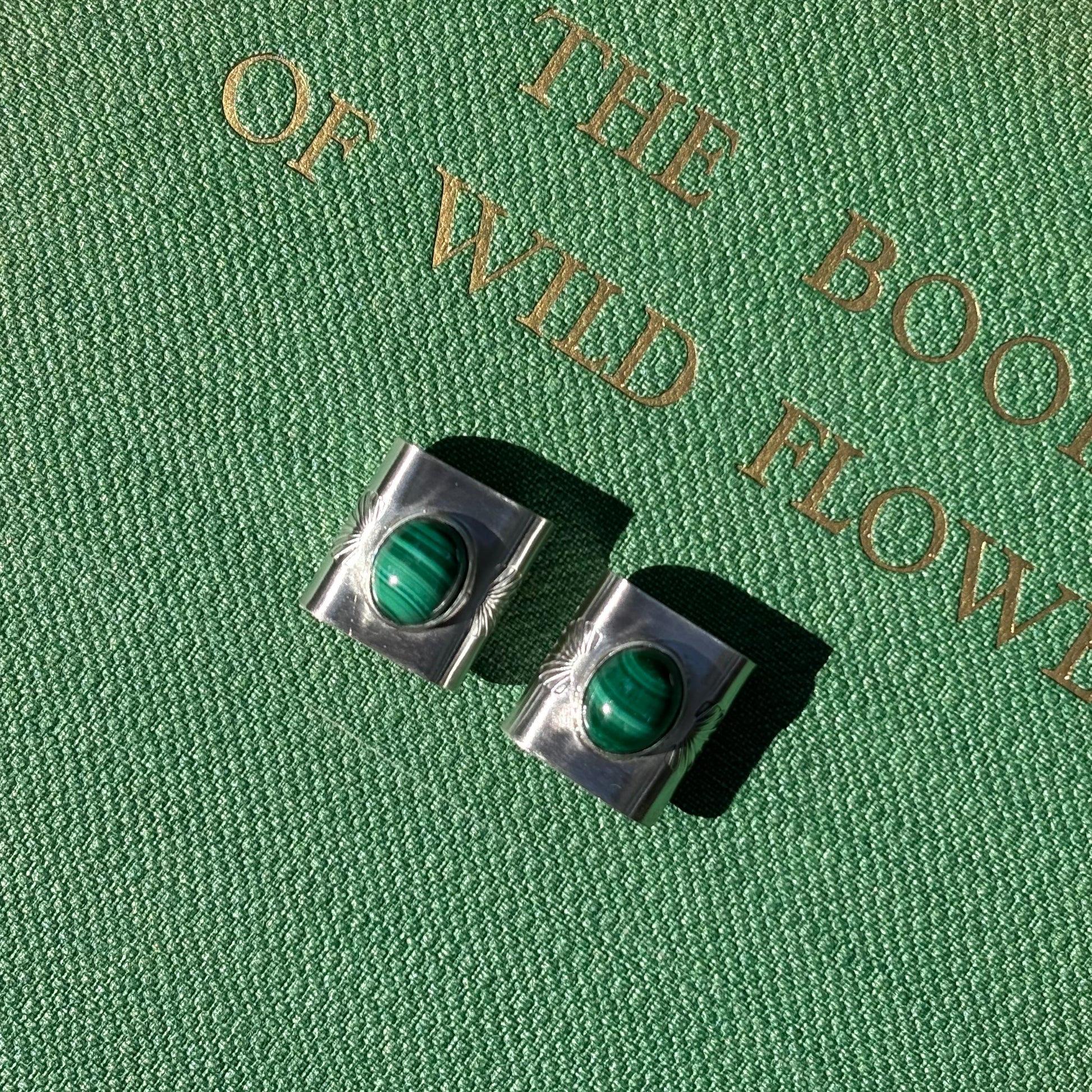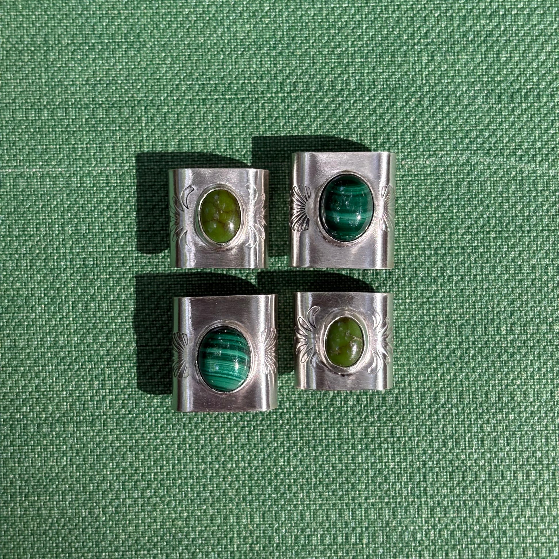 Adorn your braids with these hand crafted cuffs featuring 8x10mm Malachite stones, shown on the far right side of the photo. Stamped details frame the stone on either side.