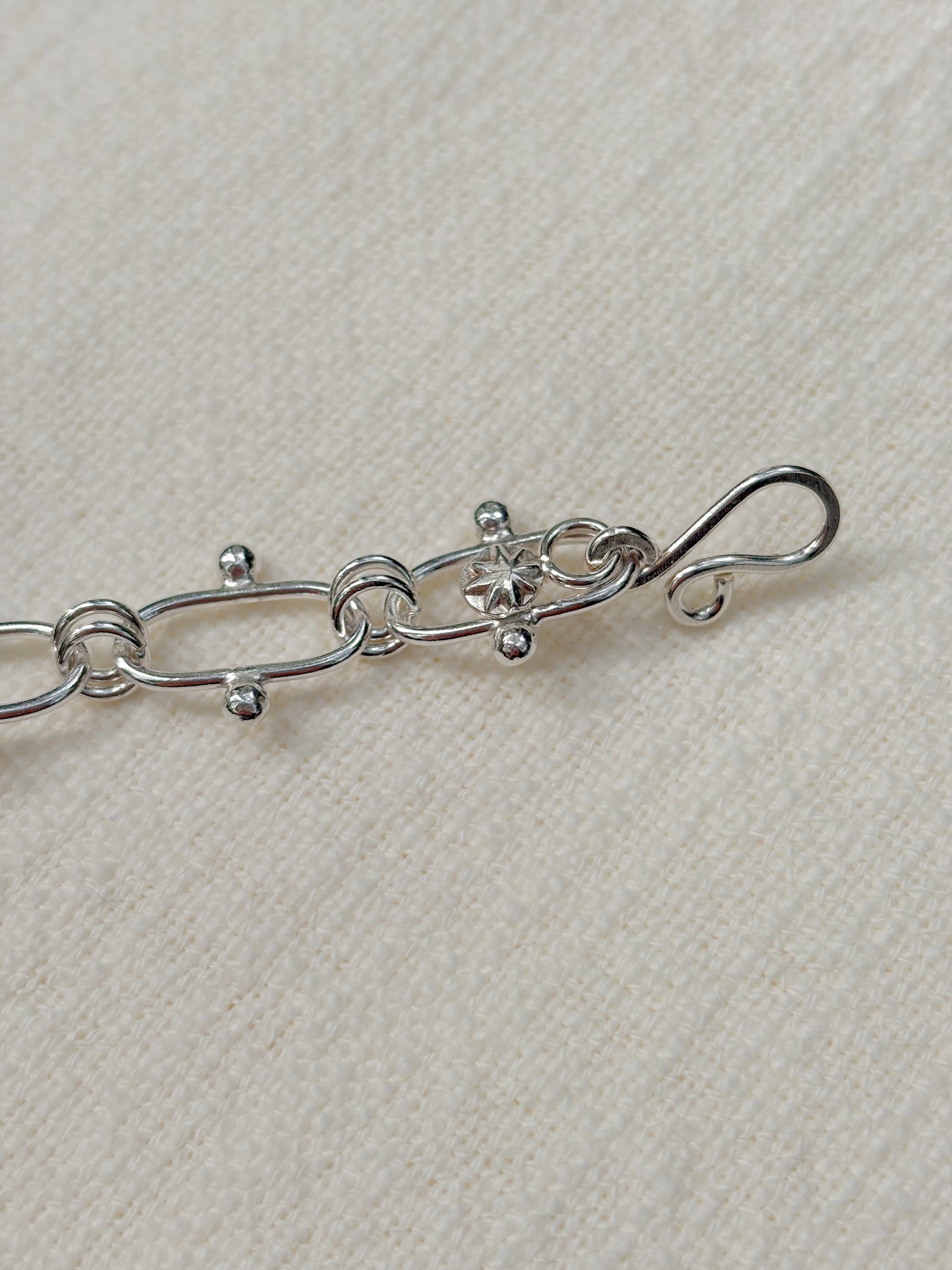 Hand crafted chain with a little extra funk. Features signature hook clasp & star charm. Measures 7 inches, please shoot me a message if you need the size adjusted:)
