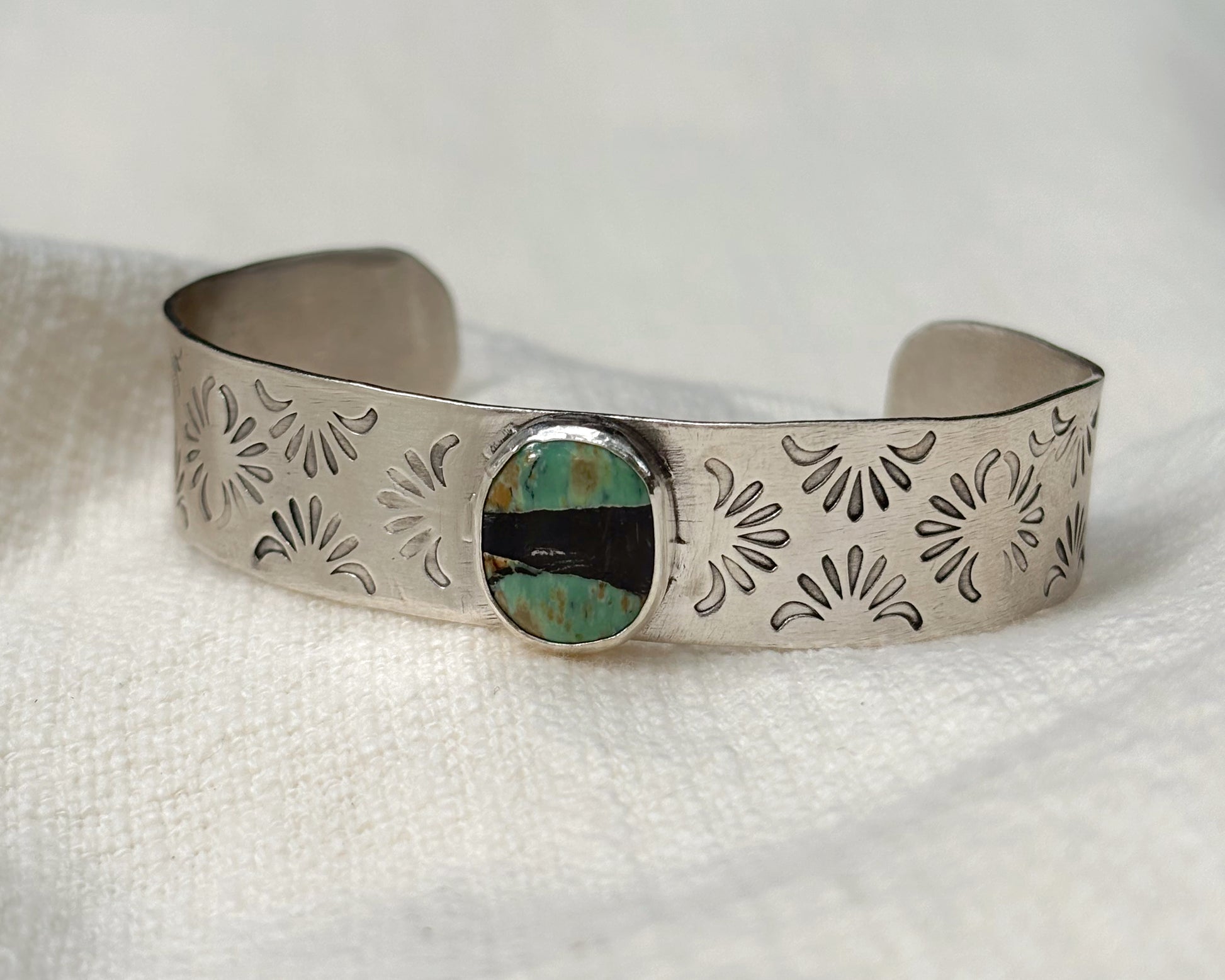 Thick gauge sterling silver makes up this chunky stamped cuff featuring a Variscite stone. Considered a size small, this cuff is best for those with wrists measuring 6-6.5 inches. Can be gently adjusted to fit your body.