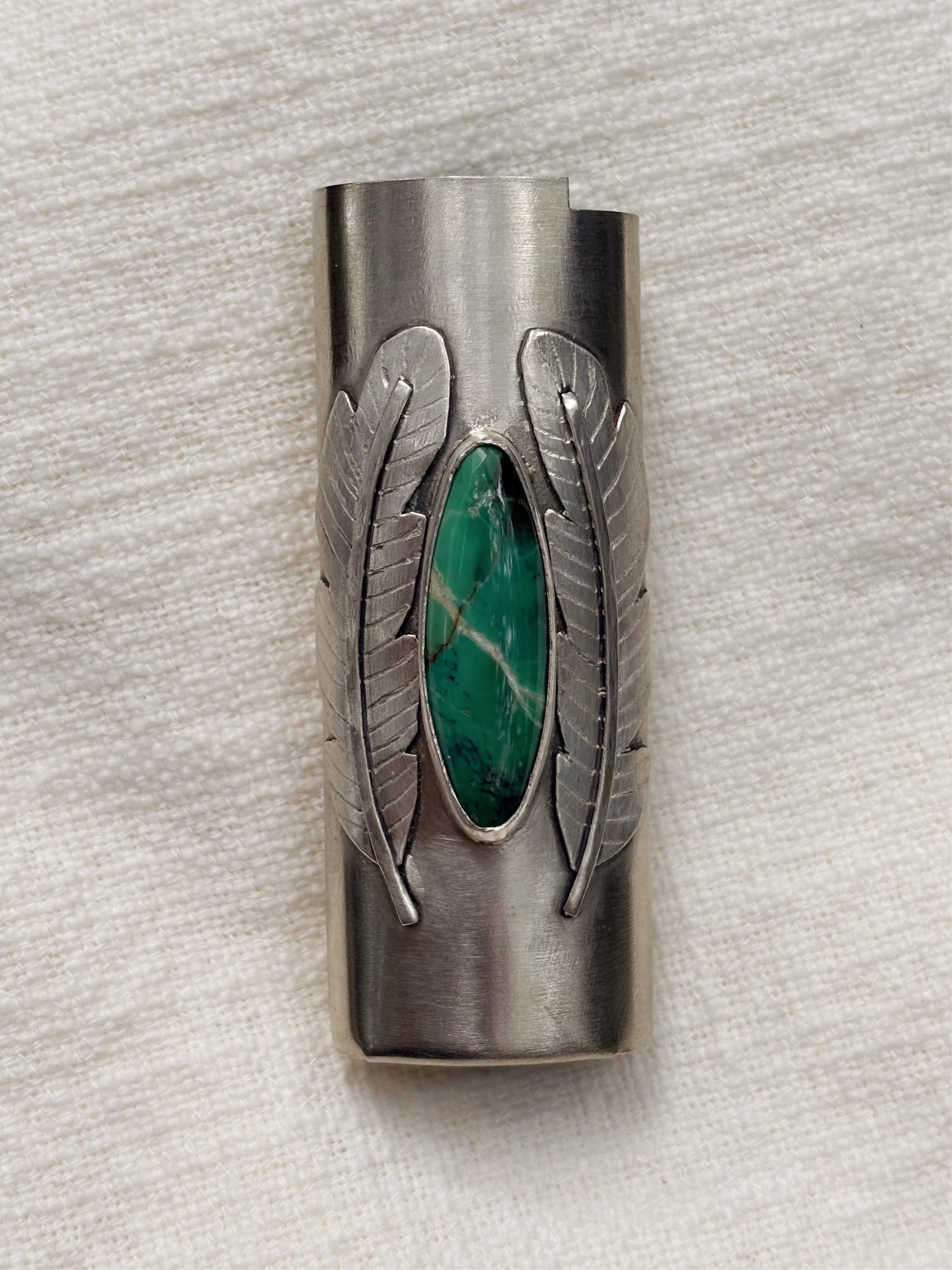 Nickel lighter case adorned with hand carved sterling silver feathers & Variscite. Fits Bic lighters. The ultimate statement piece for the classiest of stoners ;)
